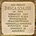 | Therese Adler, geb. Rosenthal | 1887 – ?? | Deportation in das Ghetto Izbica, Tod wahrscheinlich im Ghetto Krasnystaw, genauer Todeszeitpunkt unbekannt | Hartmannstraße 5 |