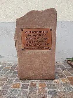 Vor dem Rathaus wurde 2005 im Rahmen eines ökumenischen Jugendprojekts ein Gedenkstein „Zur Erinnerung an die Deportation jüdischer Mitbürger aus Neidenstein am 22. Oktober 1949“ errichtet.