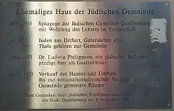 Erst nach der Auflösung des Damenstiftes 1802 siedelten sich wieder Juden in Quedlinburg an. Hinter der Bedeutung der jüdischen Gemeinde von Halberstadt blieb Quedlinburg jedoch weit zurück. Als Gemeindehaus diente das Gebäude Hölle 5. 1903 wurde wegen Baumängeln ein Nutzungsverbot ausgesprochen. Die Gemeinde nutzte dann zeitweise den Franziskanerbau, anschließend den Sitzungssaal des Hagenschens Freihaus. Ab 1922 fanden die Gottesdienste zeitweise auf dem Grundstück Blasiistraße 13, an der Carl-Ritter-Straße, statt.[1] Von 1935 bis 1937 befand sich der Gebetsraum der Gemeinde im Haus Goldstraße 25.