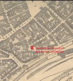 Im Jahre 1479 wurde erstmals anlässlich einer Erneuerung des Gebäudes die Synagoge genannt,[4] wohl mit Mikwe (Judenbad). Als Standort wird das heutige Friederike-Schäfer-Heim (Altenheim) in der Judengasse/Ecke Nußgasse vermutet.[1] Die Synagoge stand wahrscheinlich am südwestlichen Ende der Judengasse, an Stelle der einstigen Häuser Judengasse Nr. 25 und 27,[4] dem heutigen Nord- und Ostflügel des Altenheims. Die Synagoge hatte drei Straßenfronten:[4] zur Judengasse, zur Petersgasse und zur westlichen Verlängerung der heutigen Nußgasse (einst auch Petersgasse, die vor dem Bau des Altenheims von der Spitalstraße bis zum Mainufer durchlief). Unter oder neben der Synagoge befand sich das Judenbad.[4] Die jüdische Gemeinde dürfte einen Vorsteher, Judenrat und wohl auch einen Rabbiner gehabt haben.[1][2] Der mittelalterliche Judenfriedhof lag am heutigen Jägersbrunnen, 500 m westlich der Judengasse (siehe: Jüdischer Friedhof, Mittelalterlicher Friedhof).