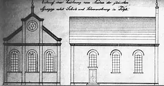 Die Fassade der Synagoge war durch drei hohe Rundbogenfenster gegliedert. Über dem mittleren befand sich ein zusätzliches Rundfenster. Auf der Giebelspitze war ein kleines Türmchen mit Davidstern angebracht. Der Eingang lag an der links der Front verlaufenden Judengängsken, das inzwischen offiziell so benannt wurde. Die einzige bildliche Darstellung der Telgter Synagoge ist die Bauzeichnung von 1874. Vom Innenraum sind keine Abbildungen erhalten. Schilderungen von Zeitzeugen zufolge wurde die Torarolle in einem durch einen roten Samtteppich geschmückten Toraschrein an der Stirnseite des Gotteshauses aufbewahrt, vor dem die Bima stand. Insgesamt standen auf jeder Seite rund fünf einfache Eichenbänke. Die Innenwände waren weiß gekälkt, sodass sich die Buntverglasung der Fenster deutlich abhob. In der Mitte des Raumes hing ein Kristallleuchter. Im Synagogengebäude befand sich neben einem Schulraum auch die Wohnung des jüdischen Lehrers.[3]