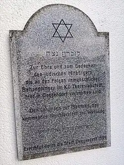 Im Jahr 1989 wurde eine Gedenktafel angebracht. Die Inschrift lautet: „Zur Ehre und zum Gedenken den jüdischen Mitbürgern, die an den Folgen unmenschlicher Behandlungen im KZ Theresienstadt, hier in Deggendorf verstorben sind“.