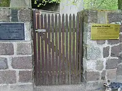 Der Eingang zum Friedhof befindet sich direkt an der Bergstraße, das einflügelige Holztor ist nicht verschlossen. Weitere Eingänge befinden sich auf der südlichen Seite des Friedhofes direkt am angrenzenden Wohnweg sowie ein weiterer Eingang an der Bergstraße, direkt neben dem Wohngebäude von dem aus ein schmaler Pfad zu einem Nebeneingang führt, der durch die Bewohner benutzt wird.