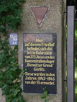 Hier / auf diesem Friedhof / befindet sich die / letzte Ruhestätte / von 323 Insassen des / Konzentrationslager / „Biesnitzer Grund“ / Görlitz. / Diese wurden in den / Jahren 1943–1945 / von der SS ermordet.