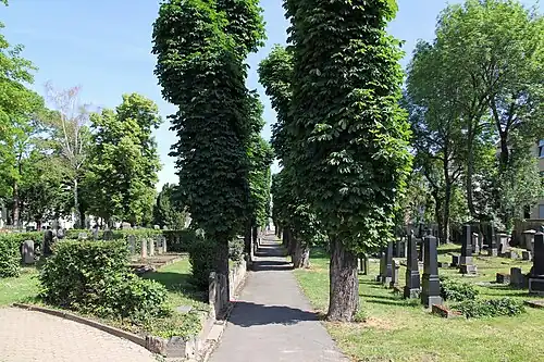 Die Form der heutigen 8590 m² großen Anlage mit einer Kastanienallee längs des Friedhofs wurde im 19. Jahrhundert angelegt. Die 38 Rosskastanien sind seit 1937 ausgewiesene Naturdenkmale.[5] Als Grabsteine werden meist stehende Platten in traditionell halbrund geschlossener Form, aber auch Obelisken, Säulen und Stelen verwendet sowie liegende sarkophagartige Grabmäler. Alle sind hebräisch, größtenteils zusätzlich auch lateinisch, beschriftet. Einige wenige Grabsteine besitzen zusätzlich Motive, wie beispielsweise der für Abraham Loeb († 1910) mit einer Kanne der Leviten. Auf der Westseite der Allee bilden alte Grabsteine und Bruchstücke aus der Barockzeit, der älteste aus dem 17. Jahrhundert, eine Mauer. Sie wurde als Stützmauer errichtet, als 1922 der Friedhof aufgeschüttet wurde. In der Mauer sind allerdings auch einige Grabsteinfragmente verbaut, die alle eine ähnliche Größe und eine rechteckige Form aufweisen – vermutlich sind es die während der NS-Zeit zu Treppenstufen verarbeiteten Stücke.