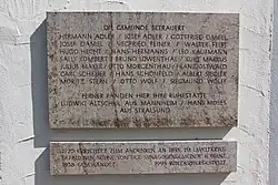 Im Zentrum der westlichen Hälfte steht ein 1947 aufgestellter Gedenkstein, in Erinnerung an die von den Nationalsozialisten im Holocaust ermordeten Juden. Auf der Stele aus Muschelkalk mit abschließendem Blattkranz steht unter einem Davidstern zu lesen: