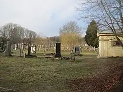 Neben den schwarzen Obelisken, die die Grabstellen markieren, sind noch viele Grabsteine aus dem 19. Jahrhundert zu sehen. Darüber hinaus gibt es einen Gedenkstein für die Opfer des Holocaust.[1]