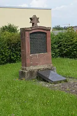 „Hier stand ein jüdischer Friedhof, der im Jahre 1939 dem Naziterror zum Opfer fiel. Aus den zerschlagenen Grabsteinen wurde dieses Monument errichtet:“(Jahresangabe fehlerhaft in der Inschrift)