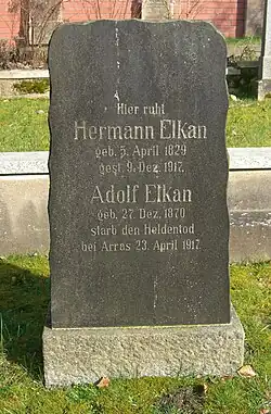 auf dem Grabstein auch Gedenken an den 1917 in Frankreich gefallenen Sohn Adolf Elkan |
