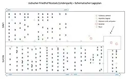 Nachdem sich ab 1868 Juden wieder in der Stadt niederlassen durften, gründeten sie 1870 die Israelitische Gemeinde Rostock[3] mit 118 Seelen im Jahre 1871.[4] Die Gemeinde eröffnete noch im Jahr ihrer Gründung den noch heute bestehenden Jüdischen Friedhof.[5] Eingerichtet wurde dieser auf etwa 3500 Quadratmetern am südlichen Rande, aber außerhalb des damaligen, zwischen 1831 und 1959 mit Gräbern belegten, öffentlichen Friedhofs auf städtischem Grund, der heute als Lindenpark umgewidmet ist. Jüdische Gemeinden nehmen ewige Grabruhe als verbindlich an, daher eröffnen sie Friedhöfe auf eigentümlich erworbenem Grund, um jeder Störung der Totenruhe durch spätere Neubelegung, Abräumung von Gräbern oder gar Umwidmung des Geländes wehren zu können.