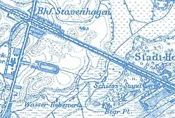 Jüdische Friedhöfe wurden in den amtlichen Karten als Begräbnisplatz bezeichnet und mit einem L statt einem † signiert. Meistens wurden sie weiter außerhalb der Städte oder Gemeinden angelegt, überwiegend an den Scheunenvierteln oder ähnlichen abgelegenen Orten. In Stavenhagen befand sich der Friedhof in einem Wäldchen auf dem Os-Zug an der Bahnlinie weit vor der Stadt.[1]