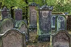 Die Grabsteine auf dem älteren Nordteil bestehen großenteils aus Sandstein. Der wohl älteste Grabstein mit noch lesbarer Inschrift stammt aus dem Jahr 1696 und bezeichnet das Grab eines Eisik Jizchak ben Mosche. Eine erste Inventarisierung führte der Oberlehrer Josef Preßburger 1930 durch. Er zählte 341 Grabsteine, deren Inschriften er noch entziffern konnte, und zahlreiche weitere mit unlesbaren Inschriften. 1997 wurden die Grabsteine neu katalogisiert.