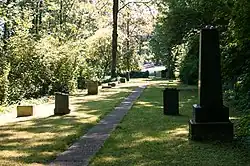 Nur etwa 11 Grabmonumente blieben erhalten oder wurden nach dem Zweiten Weltkrieg wieder aufgestellt. Unter ihnen ist ein etwa 2 m hoher Obelisk aus geschliffenen schwarzen Marmor.