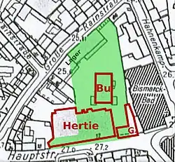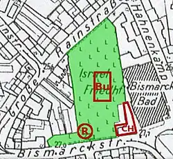 Das Gelände auf einer Karte von 1980 mit der Fläche des jüdischen Friedhofs von 1934 (grün). Bu steht für Bunker, G für Schuhhaus Görtz.