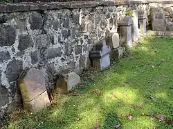 „Am Rande der Ortsbebauung befindet sich auf einem Grasfeld der jüdische Friedhof mit etwa elf Grabsteinen des frühen 20. Jahrhunderts. Einige Steine sind nur noch bruchstückhaft vorhanden, teilweise sind lediglich die Bekrönungen erhalten. Zwischen den entlang der Umfassungsmauer aufgestellten Grabsteinen befindet sich in der nördlichen Ecke ein 1988 zur Mahnung an die Reichskristallnacht aufgestellter Gedenkstein.“[1]