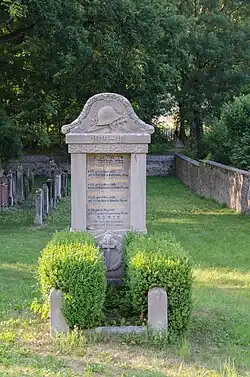 Das Denkmal wurde zu Ehren der im Ersten Weltkrieg gefallenen Soldaten aus der jüdischen Gemeinde Aub errichtet. Unter den soldatischen Symbolen Stahlhelm und Degen sind die Namen der vier gefallenen jüdischen Gemeindemitglieder aufgeführt: