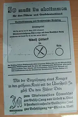 Bei der nach dem sog. Anschluss Österreichs an Nazi-Deutschland im Nachhinein durchgeführten Volksabstimmung (gleichzeitig mit der Wahl zum Deutschen Reichstag) erhielt das „Ja“ insofern prominente Bedeutung, als ein Nein – abgesehen von der herrschenden politischen Pro-NS-Stimmung – schon allein aufgrund des ohnehin bereits vollzogenen Anschlusses für den kritischen Wähler lächerlich wirken musste. Zudem wurde mit der Abstimmung eine Junktimierung vorgenommen, als dass mit der Zustimmung zum Anschluss man auch gleichzeitig für Adolf Hitler als Reichskanzler stimmte. Die Frage zur Volksabstimmung lautete in Österreich lt. Gesetzblatt: „Bekennst du dich zu unserem Führer Adolf Hitler und damit zu der am 13. März 1938 vollzogenen Wiedervereinigung Österreichs mit dem Deutschen Reich?“[7] Der Scheincharakter der Volksabstimmung zeigte sich auch in der unterschiedlichen Größe der Antwortmöglichkeiten auf dem Wahlzettel, auf dem das Ja wesentlich größer abgebildet war, was die Suggestivfrage auf dem Wahlzettel unterstützte.