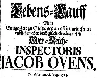 - ↑ Jacob Ovens: Lebens-Lauff Mein Einige Zeit zu Stade ver-arrestirt gewesenen endlichen aber doch glücklich echappirten Ober-Teich-Inspectoris Jacob Ovens. Leipzig 1724, S. 5 f. (books.google.de).