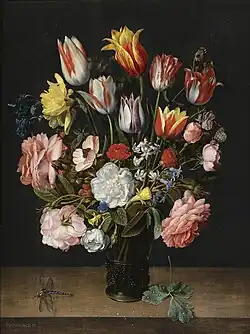 - ↑ Jacob van Hulsdonck (1582–1647), A still life of tulips, roses, bluebells, daffodils, a peony and other flowers in a glass roemer on a wooden ledge with a dragonfly, Website des Sotheby’s.