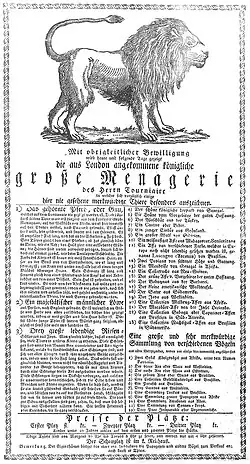 - Annelore Rieke-Müller, Lothar Dittrich: Unterwegs mit wilden Tieren. Wandermenagerien zwischen Belehrung und Kommerz 1750–1850. Basilisken-Presse, Marburg 1999; S. 33–39 ISBN 3-925-34752-6