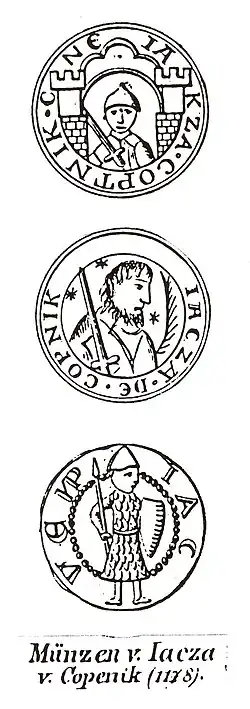 - ↑ a b Bernd Kluge: Jacza de Copnic und seine Brakteaten – Fakten, Thesen und Theorien zum ältesten Thema der brandenburgischen Numismatik. 2009, S. 14–42; Bernd Kluge: Die Anfänge der Münzprägung in Brandenburg bis um 1170. Pribislav Heinrich, Albrecht der Bär, Jacza und Otto I. 2011, S. 7–34.
