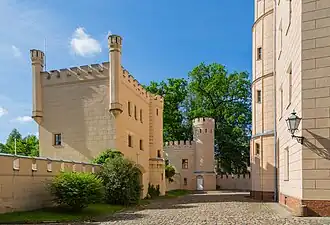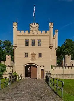 Die nachfolgenden Hohenzollernherrscher bevorzugten andere Reviere oder fanden kein Interesse an der Jagd, bis Friedrich Wilhelm IV. das Schloss 1840 wiederentdeckte. Auf den Mauern der verfallenen Jagdburg ließ er nach Plänen des Architekten Friedrich August Stüler ein Schloss in den Formen der englischen Neugotik errichten. 1843/44 erfolgte durch Stüler der Umbau des Corps de Logis. Dieses Haupthaus mit quadratischem Grundriss wurde viergeschossig aufgestockt. Ein runder Treppenturm, der dem Gebäude vorgelagert ist, überragt alle Bauten des Geländes. Durch Umbau des hohen Torhauses im Osten und der vier Ecktürme der Ringmauer erhielten die Bauten eine stilistische Anpassung in der neugotischen Form. Alle Gebäude schließen am Dachrand mit einem Zinnenkranz ab. Vermutlich in den Jahren 1851 bis 1853 erfolgte nach Stülers Plänen der Umbau des Speisesaals und der Küche. Die Leitung der Arbeiten übernahmen der Bruder des Architekten, Bauinspektor Karl Askan Stüler, und der Magdeburger Baurat Karl Albert Rosenthal.