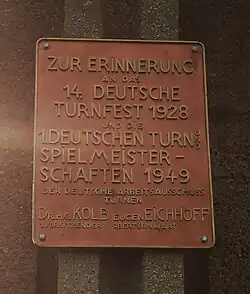 - ↑ Harald Rösch: Gedenktafel zum Turnfest am alten Ort. Rheinische Turnzeitung, September 2012, S. 27, archiviert vom (nicht mehr online verfügbar) am 12. März 2017; abgerufen am 9. März 2017. Info: Der Archivlink wurde automatisch eingesetzt und noch nicht geprüft. Bitte prüfe Original- und Archivlink gemäß Anleitung und entferne dann diesen Hinweis. (pdf)