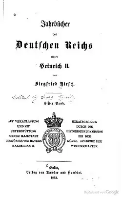 - Siegfried Hirsch, Hermann Pabst, Harry Bresslau: Jahrbücher des Deutschen Reichs unter Heinrich II., 3 Bände, Leipzig 1862, 1864, 1875