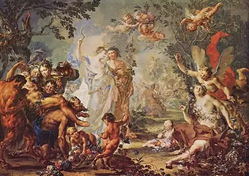 Die Person des Herbstes ist häufig mit Weintrauben und bunten Blättern geschmückt.