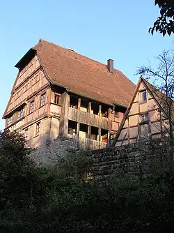 Der dreigeschossige Schopfwalmdachbau mit Sandsteinerdgeschoss und Fachwerkobergeschossen mit Ziegelausfachung und vorkragenden Giebelgeschossen ruht auf der Stadtmauer.