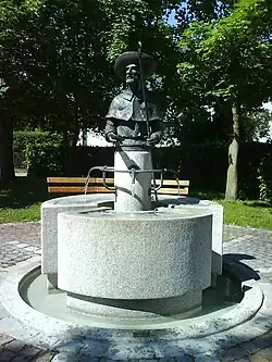 Der Pilgerheilige wird als Halbfigur mit Schlapphut und Wanderstab dargestellt. Sein Mantel ist mit zwei Jakobsmuscheln verziert, in der anderen Hand hält er eine kleine Schale. Die dreigeteilten Becken, in denen die Ausläufe aus Bronze münden, bestehen aus Bayerwald-Granit und münden wiederum in ein kreisrundes Becken auf dem Boden. Dadurch kann man sich oben an den Ausläufen die Hände waschen, sich in den dreigeteilten Becken die Arme und im untersten Becken die Füße abkühlen. Die drei Segmente der Becken wiederholen sich in der kreisförmigen Fläche um den Brunnen in Form von Porphyrsteinen. Somit findet sich die Brunnenform nochmals auf dem Boden wieder. Zudem wird die Anlage durch ein Blumenbeet, welches durch den Verein "Blumen- und Gartenfreunde" bepflanzt und gepflegt wird,[1] zur Salzstraße hin eingerahmt. Zur Osterzeit wird der Brunnen alljährlich mit Ostereiern geschmückt, die von Schülerinnen und Schülern aus den umliegenden Grundschulen mit bemalt wurden. Um den Brunnen herum befinden sich mehrere Bäume, und drei halbrunde Sitzbänke, die vom Bauhof in einer Sonderanfertigung hergestellt wurden.