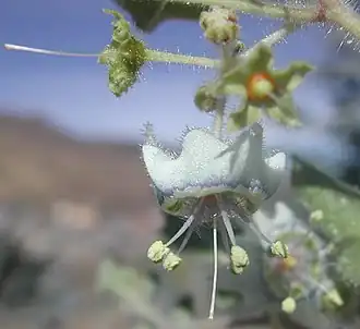 Der Kelch ist zur Blüte grün gefärbt und misst von der Basis bis zu den Spitzen der Kelchzipfel 3 bis 4 mm lang. Der Rand des Kelches ist bewimpert, die Trichome sind verzweigt und 0,25 mm lang und drüsig und dann bis 1 mm lang. Auf der Innenseite des Kelches befinden sich bis zu 4 mm lange Trichome. Zur Fruchtreife vergrößert sich der Kelch auf einen Durchmesser von 13 mm und ist sternförmig.