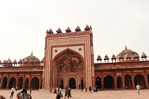 Das in der Mitte der Ostseite des Moscheehofes stehende ca. 40 m hohe und 35 m breite Monumentaltor steht auf einer künstlich aufgeschütteten Plattform von ca. 13 m Höhe und war ursprünglich nicht in dieser Form geplant; es wurde als Siegestor in den Jahren nach 1573 errichtet und möglicherweise erst im Jahr 1601 vollendet. Seine Außenfassade ist trapezförmig (oder semioktagonal) angelegt und seine Außenwirkung wird durch eine zum Tor hinaufführende Treppe noch gesteigert. Die zahlreichen Inkrustationen und Kalligraphien kommen erst in der Nähe zur Geltung. Eine der Inschriften lautet: