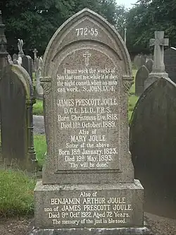 Von 1872 an plagten Joule gesundheitliche Probleme. Als er in späteren Jahren in finanzielle Schwierigkeiten geriet, gewährte ihm die britische Königin Victoria ab 1878 eine Pension von jährlich 200 Pfund, zu dieser Zeit schwanden seine geistigen Kräfte.[8] Er verstarb nach langer Krankheit in seinem Haus in Sale am 11. Oktober 1889 und wurde auf dem Friedhof in Brooklands beigesetzt. Auf seinem Grabstein ist der Zahlenwert 772,55 des Wärmeäquivalents zu sehen, in den damals gebräuchlichen Einheiten gibt dieser 1878 von James Joule gefundene Wert die Energie an, die für die Erwärmung eines Pfunds Wasser um ein Grad nötig ist.