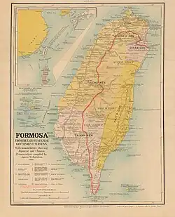 - ↑ James Wheeler Davidson: The island of Formosa, past and present: history, people, resources, and commercial prospects: tea, camphor, sugar, gold, coal, sulphur, economical plants, and other productions. London/New York 1903. S. 304.