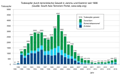 Seither herrschte überwiegend eine Situation angespannter Ruhe in Jammu und Kaschmir. Die Zahl der Opfer von gewalttätigen Auseinandersetzungen ist deutlich zurückgegangen. In den vergangenen Jahren kam es wiederholt zu Massendemonstrationen und Auseinandersetzungen von radikalen Jugendlichen mit den Polizeikräften, die zahlreiche Todesopfer forderten.[21] Die indischen Sicherheitskräfte wurden (genauso wie die militanten Kaschmir-Aktivisten) von Amnesty International beschuldigt, Menschenrechtsvergehen verübt zu haben, ohne dass die dafür Verantwortlichen strafrechtlich zur Verantwortung gezogen worden seien.[22] Nach offiziellen indischen Schätzungen waren im Jahr 2015 im Norden des Bundesstaats 66 „einheimische“ und 44 ausländische Terroristen aktiv. Im Süden waren die Zahlen 109 und 7. Damit rekrutierten sich erstmals seit längerem auch nach offiziellen Schätzungen die Mehrheit der militanten Kämpfer aus der einheimischen Bevölkerung.[23]