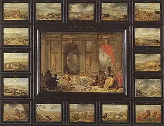 Jan van Kessel schuf zwei Serien von allegorischen Gemälden, die die Vier Teile der Welt oder die Vier Kontinente darstellen. Diese Serien aus den 1660er Jahren bestehen aus vier zusammengesetzten Bildern, die sich aus 16 Mini-Ölgemälden auf Kupferplatten zusammensetzen, die um ein größeres Gemälde, ebenfalls auf Kupfer, angeordnet und in ein unterteiltes Ebenholzkabinett montiert sind. Die Mittelstücke stellen die Kontinente Europa, Asien, Afrika und Amerika durch eine Vielzahl von Figuren in ethnischer Kleidung und exotischen Tieren dar. Die umliegenden Platten stellen einzelne Städte und geografische Gebiete dar, in denen vermeintlich einheimische Flora und Fauna gezeigt werden.[4]