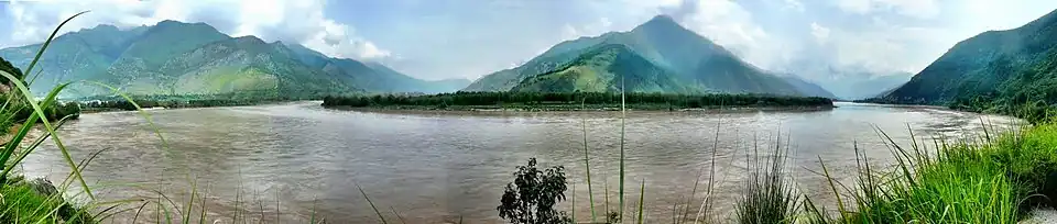 Knapp 1500 Kilometer stromabwärts umfließt der Fluss in Hufeisenform einen Berg (⊙); im weiteren Verlauf, abgelenkt durch ein Kalksteinmassiv, kehrt sich der bisher in südöstliche Richtung fließende Fluss nach mehreren Richtungswechseln an der Großen Biegung von Shigu (⊙) um und fließt weiter durch die Tigersprung-Schlucht in nordöstlicher Richtung.