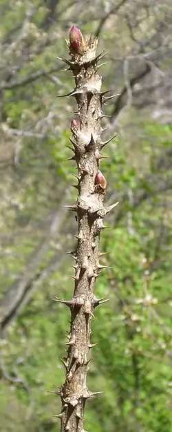 Die wechselständigen und langstieligen Laubblätter sind bis zu 80 cm lang und ein- bis dreifach gefiedert. Die Rhachis 1. und 2. Ordnung und der Blattstiel sind teils bestachelt. Die eiförmigen, fast sitzenden bis kurz gestielten Blättchen sind, teils spitzig, gesägt oder gekerbt und unterseits mehr oder weniger behaart bis oberseits leicht borstig und zugespitzt. An den Fiedern 1. Ordnung steht an der Rhachis jeweils ein zusätzliches Blättchen. Im Herbst zeigen die Blätter eine rötlich-gelbe Färbung und werden dann abgeworfen.