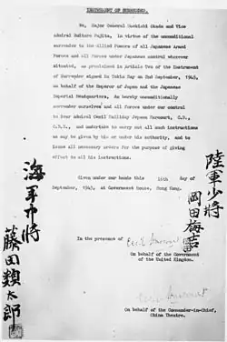 - ↑ Japan, Großbritannien und China bei der Unterzeichnung der Kapitulation im „Government House of Hong Kong“ – 香港禮賓府, dt. etwa „Residenz zum protokollarischen Gästeempfang des Regierungschefs von Hongkong“, 15. September 1945 Central, Hong Kong Island.