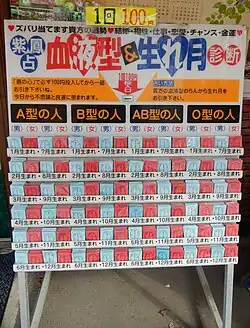 Die Deutung der Blutgruppe ist ein vor allem in Japan verbreiteter Glaube, nach dem die Blutgruppe (japanisch 血液型 ketsueki-gata) Rückschlüsse über Persönlichkeit, Charakter und Verträglichkeit einer Person mit anderen zuließe. Das Phänomen hat im japanischen Alltag einen vergleichbaren Stellenwert wie etwa die Tierkreiszeichen im Westen.[1] Zunehmend ist dieser Glaube auch in anderen Teilen Ostasiens, namentlich Südkorea und Taiwan, anzutreffen.