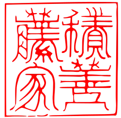 - * Stempel des Kaufmanns Aoyagi Bunzō[71][2] 「勿折角勿巻脳勿以墨汚勿令鼠噛勿唾幅掲」 (sinngemäß: Nicht die Ecken knicken, nicht ... einwickeln, nicht mit Tinte bekleckern, nicht von Mäusen annagen lassen, nicht auf die Seiten spucken)[72]