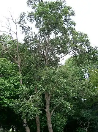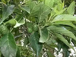Die Laubblätter sind derbledrig, lanzettlich bis schmal eiförmig, 5 bis 13 Zentimeter lang und haben einen 1,5 bis 2,5 Zentimeter langen Stiel. Beide Enden sind scharf zugespitzt. Die Blattspreite zeigt sieben bis neun Nervenpaare. Der Blattrand ist fein gesägt. Die Blattoberseite ist glänzend dunkelgrün, die Unterseite ist heller als die Oberseite. Die Blätter fallen im Herbst erst spät ab.[1]