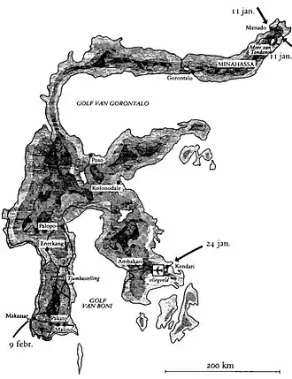 - Eroberung der Gebiete im Osten von Celebes und der Bandasee mittels Marineeinsätzen bei Manado (ca. 10. Januar), Kendari (ca. 20. Januar) und Makassar (zwischen 25. Januar bis 14. Februar), sowie Armeeeinsätze auf Ambon (ca. 25. Januar) und in Kupang (ca. 5. Februar)