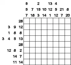 - Die Ziffern addieren sich zu den am Rand angegebenen Summen (in der vorgegebenen Reihenfolge), verschiedene Summen sind durch Leerfelder getrennt.