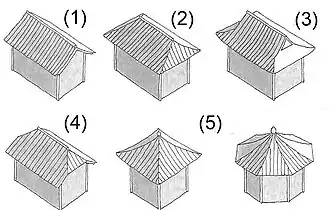 Die großen Dächer sind ein wesentliches Element des Tempels. Sie laufen in der Regel mit einem aufwendig gestalteten Unterbau in Schwüngen aus. Man unterscheidet folgende Typen: