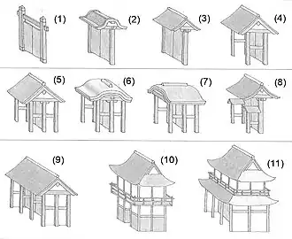 - hakkyaku-mon (八脚門), achtfüßiges Tor (mit acht Hauptpfeilern)