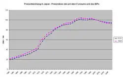 Die Wirtschaftskrise 2007 stürzte Japan allerdings wieder in die Deflation. 2009 betrug diese 2,4 % und hatte damit sogar den Wert der Deflation in der verlorenen Dekade übertroffen.[39] Durch die nun schon zwei Dekaden anhaltende Deflation spricht man inzwischen schon von Ushinawareta Nijūnen („Zwei verlorene Dekaden“).