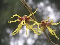 Die leicht duftenden Blüten erscheinen im Januar bis März an den einjährigen Zweigen, sie erfrieren bei mäßigen Frösten (bis etwa −5 °C) noch nicht. Die Blüten erscheinen zu dritt achselständig. Die zwittrigen Blüten mit doppelter Blütenhülle sind vierzählig. Es ist ein innen purpur-violetter, außen dicht behaarter Blütenbecher vorhanden. Sie besitzen außen braunsamtige, innen purpurne und zurückgelegte Kelchblätter und vier bandförmige, hellgelbe, oft etwas zerknittert aussehende Kronblätter von 1 bis 1,7 cm Länge. Bei Frost rollen diese sich ein oder hängen schlaff; beim Auftauen straffen sie sich und richten sich wieder auf. Das kann während der mehrere Wochen langen Blütezeit jeden Tag der Fall sein. Es sind 4 kurze Staubblätter und 4 kurze, nektarabsondernde Staminodien ausgebildet. Der behaarte Fruchtknoten ist mittelständig mit zwei kurzen Griffeln.