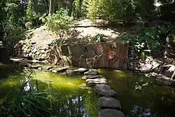 Der Untere Teich, der vom Großen Wasserfall gespeist wird, kann über eine Sandsteinbrücke überquert werden. Vom Oberen Teich, dessen Wasser durch Pflanzenbewuchs grob gefiltert wird, fließt ein gestalteter Bachlauf am Weg entlang in den Unteren Teich. Ein weiterer Bachlauf ergießt sich vom östlichen Torbereich her über steinerne Kaskaden in den Teich. Auch hier ziehen sich mehrere Wege den Hang hinauf, die teilweise als Stufen in das anstehende Felsgestein geschnitten sind und an der Brücke enden. Am Bachufer unterhalb der Kaskaden, dem tiefsten Punkt des Gartens, ist eine Art Rasentheater im Stile eines kleinen Amphitheaters aus einer kreisrunden Fläche mit ansteigenden Sitzreihen angelegt worden. Oberhalb des Osteingangs wurde 2004 im Zuge eines Gartenseminars mit Makioka Kazuo und Irmtraud Schaarschmidt-Richter ein Stein- und Moosgarten als Zengarten angelegt. Der Garten wird von einer Lehmmauer eingerahmt und durch einen Holzsteg zweigeteilt. Beide Teile sind dem Kare-san-sui-Stil nachempfunden. Im westlichen Abschnitt ist ein stilisierter Bergsee und dessen Umgebung dargestellt. Der Abschnitt östlich des Holzstegs ist dem Zengarten des Klosters Ryōan-ji in Kyōto nachempfunden.